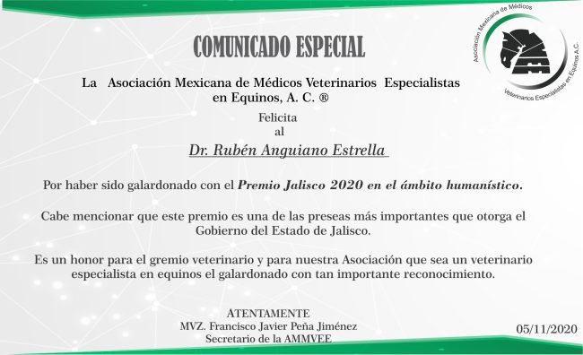 La Asociación Mexicana de Médicos Veterinarios Especialistas en Equinos, A. C. FELICITA AL DR. RUBEN ANGUIANO ESTRELLA