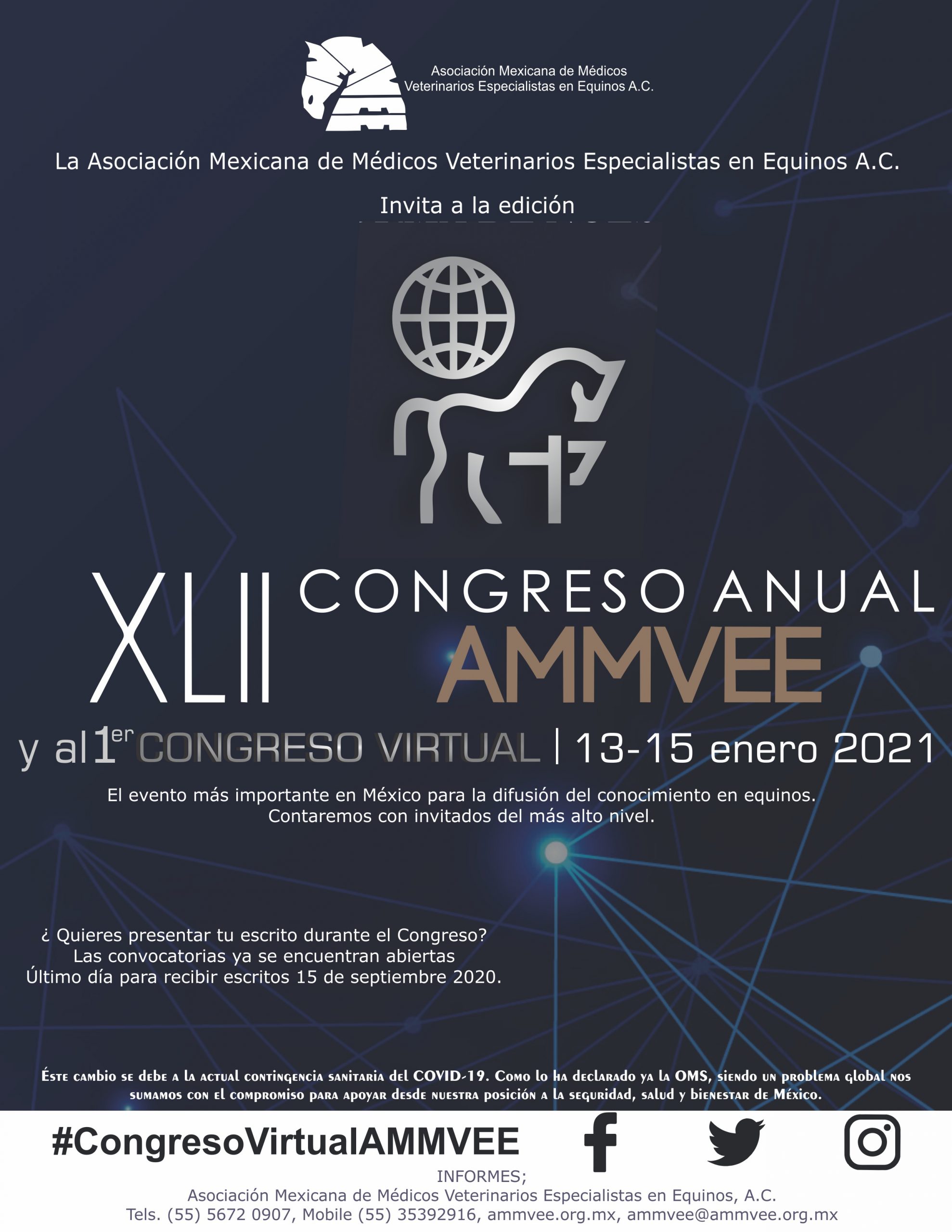 La Asociación de Especialistas en Equinos Ammvee Ammvee Ac Informa que debido a las condiciones sanitarias de salud que vivimos actualmente, nuestro 42 Congreso Anual Ammvee se llevará a cabo del 13-15 de enero en la modalidad virtual.