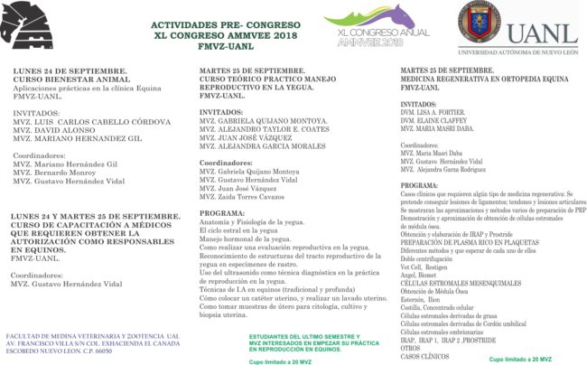 MANEJO REPRODUCTIVO EN LA YEGUA. Martes 25 de Septiembre SEDE: FACULTAD DE MEDINA VETERINARIA Y ZOOTENCIA – UAL . FRANCISCO VILLA S/N COL. EXHACIENDA EL CANADA ESCOBEDO NUEVO LEON. C.P. 66050 EL CURSO ESTÁ DESTINADO A ESTUDIANTES DE LOS ÚLTIMOS SEMESTRES DE LA CARRERA DE MÉDICO VETERINARIO Y A MÉDICOS VETERINARIOS INTERESADOS EN EL ÁREA…