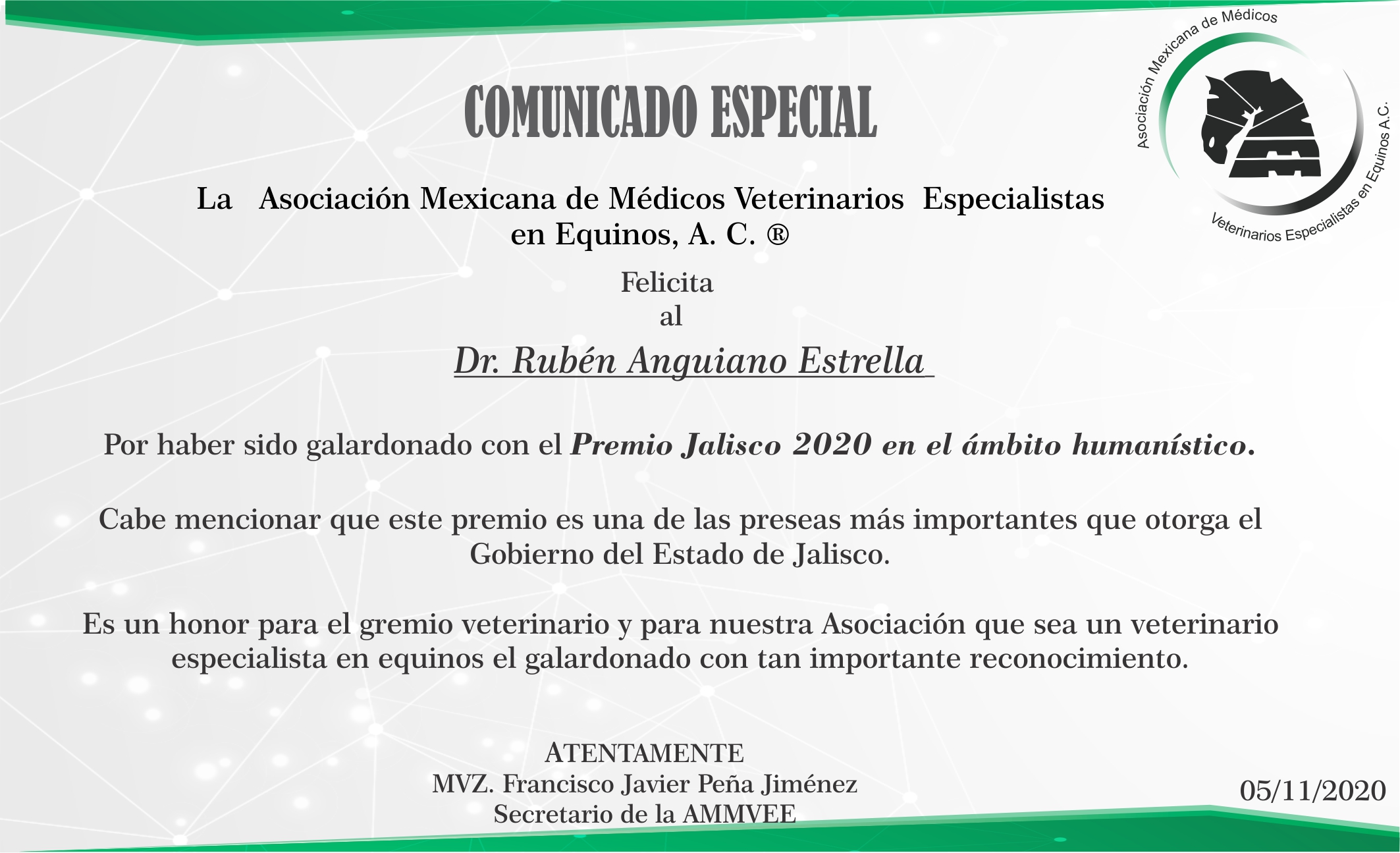 La Asociación Mexicana de Médicos Veterinarios Especialistas en Equinos, A. C. FELICITA AL DR. RUBEN ANGUIANO ESTRELLA Categorías: Avisos, Congresos, ConvocatoriasPor AMMVEE ACnoviembre 6, 2020Navegación entre publicacionesAnteriorPublicación anterior:Te perdiste de la Sesión I, Sistema Músculo Esquelético?SiguientePublicación siguiente:PIE, CUARTILLA Y MENUDILLO